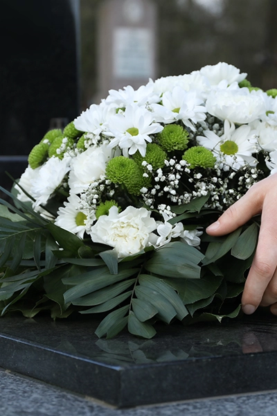Un service de livraison au funérarium est disponible pour les gerbes en accolade (frais supplémentaires).